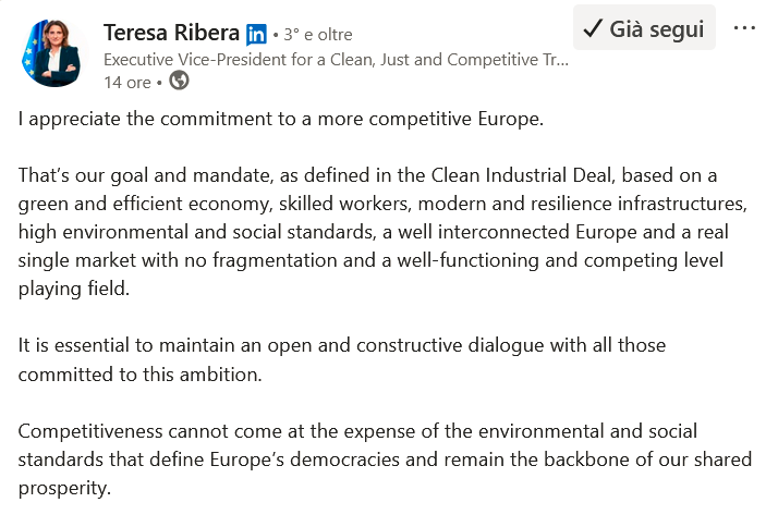 “Apprezzo l’impegno per un’Europa più competitiva. È il nostro obiettivo e il nostro mandato, come definito nel Clean Industrial Deal, basato su un’economia verde ed efficiente, lavoratori qualificati, infrastrutture moderne e resilienti, alti standard ambientali e sociali, un’Europa ben interconnessa e un vero mercato unico, senza frammentazioni e con un campo di gioco equo e competitivo.”