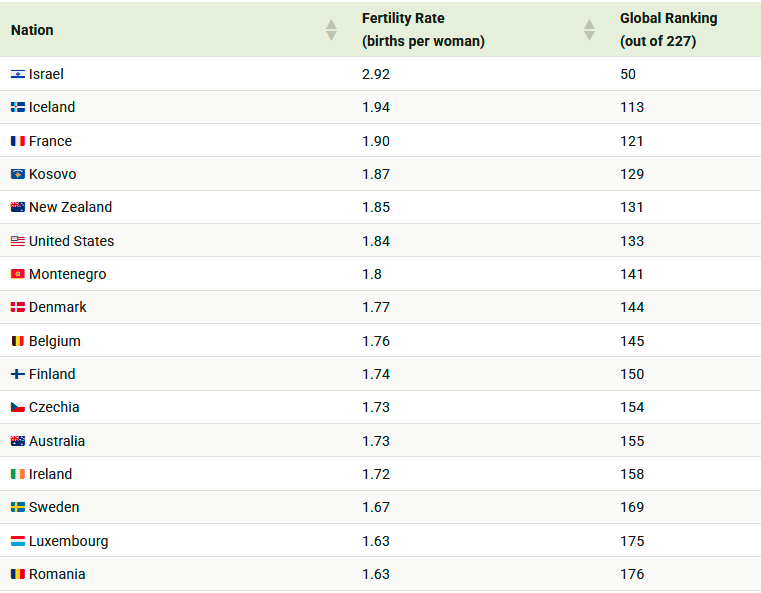 Nel resto dell’Occidente le cose non vanno meglio. L’unica che supera quota 2 nel tasso di fertilità è Israele, sfiorando un valore pari a 3 (2,92): tutti gli altri sono al di sotto questa soglia, a cominciare (sebbene di poco) l’Islanda, con un tasso di 1,92, seguita da una delle poche rappresentanti della vecchia Europa nelle posizioni più alte di questa classifica, ovvero la Francia (tasso di 1,90).